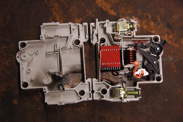 The mechanism is small enough to fit into the mini instrument pod, but the face is too big. The original mini face will fit if I make the window for the odometer bigger and enlarge the center hole slightly. The shaft is smaller but it shouldn't be too hard to fit the mini needle. I'm not sure if I should mount a remote trip meter button, or drill through everything and try to mount a button in the normal position. I'm now designing an adapter to mount the mechanism. Interestingly both cars have 180km/h speedometers, but the Mini spreads it out over more degrees. I'm not sure how hard it will be to calibrate the needle. I'm considering whether to wind the speedo forward to 200,000km and call that "electric zero" or to attempt to align it with the car's current speedo -- TachoSoft indicate that the mileage data is stored in a separate serial EEPROM.Sunday, August 11. 2013Observe Polarity of DC Switches!Many high voltage DC contactors, switches and circuit breakers are only able to perform to their specifications if the current is flowing in the expected direction. This is because they include magnets which push the arc away from the switching element and into an arc chute or other plasma management device. A wire carrying a current through a magnetic field experiences a force (this is how motors work!) and this is particularly effective in the case of an arc because the "wire" is actually made of ionized gas. The problem comes when you reverse the direction of the current -- the "blow out" magnets suddenly become "blow in" magnets and the switch catches fire. RISE did some testing of polarized DC circuit breakers intended for solar power and the results were quite spectacular. Do wait for the 40A tests towards the end! Consult the manufacturer's datasheet to ensure your switches are correctly installed! Friday, August 9. 2013Don't use AC Circuit Breakers on DCI tested a few circuit breakers rated for AC using my car's 250V DC battery. I used my load tester to limit the current to about 27A. I found that with a resistive load, the breakers successfully interrupted the current but failed safely after 5 or 10 switching cycles. Since I didn't have the equipment to limit the current to 50 or 100A, I used one of the windings in an isolation transformer to make the load more inductive and sort-of simulate a higher fault current situation. With this additional resistance, the current dropped to 23A. The results were quite scary: