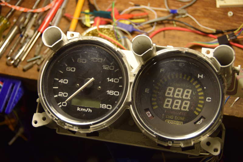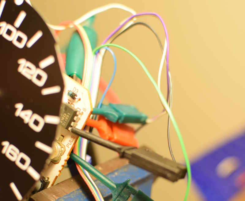 I reverse engineered the data stored in my Mitsubishi FTO Speedometer in order to re-calibrate it to suit the Mini face. Both faces show 180km/h, but the mini face spreads it over a slightly wider angle than the FTO does. The data is stored in an OKI 16811G 128 byte Serial EEPROM. This is quite an old part which uses Microwire (a predecessor and subset of SPI) to communicate. I had some trouble finding the data sheet for this part so I tried to sniff the communications between the odometer's CPU and the EEPROM with an Arduino running gillham's SUMP compatible firmware. Unfortunately the Arduino only has 2k of ram so recording all the state changes wouldn't fit. The communication is clocked at about 1MHz and I wasn't able to write a parser fast enough to stay in sync. There is a fair amount of questionable information about odometer EEPROMs on the Internet, mostly related to tools for sale to wind your odometer back. One of these references claimed the part was compatible with a 93C46 so I wrote an EEPROM reader for that part and read out the data. Unfortunately this wiped the EEPROM! Somehow my reader code triggered the erase all command. This isn't entirely surprising because the right data sheet shows this EEPROM uses a different protocol to that used in the 93C46. With a wiped EEPROM the odometer stop working, so I had to get another one. I also got an Open Bench Logic Sniffer which let me observe the entire communication between the odometer and the EEPROM and confirm that the protocol in the correct data sheet was the protocol actually in use. While re-scaling the speedometer for the new face I also reverse engineered the stored kilometre value and re-set the odometer to zero to celebrate the conversion to electric power. I also made some somewhat comprehensible notes about how this data is stored, an Arduino sketch to read and write the EEPROM which includes some tools to re-format the data, and an Arduino sketch to test an electronic speedometer and find the number of pulses per km. Tuesday, April 29. 2014SpeedometerSurprisingly the new gearbox's speedometer cable connects to the Mini speedometer. Unfortunately it interferes with the body at the gearbox end so I haven't been able to test it's calibration. I've been using the speed display on my EVision which listens to a speed pulse from my motor controller, but there is no odometer or trip meter and I would like to use display other data on the EVision, so I've been looking for an electronic speedometer to mount inside the mini instrument cluster. At the weekend I found a small electronic speedo from a Mitsubishi FTO which was new enough to be electronic but old enough to not be use the CAN bus and be small and separate from the other gauges.
